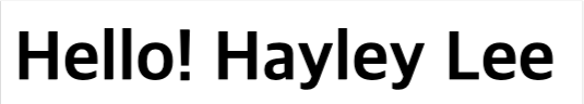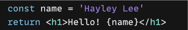 name 이라는 변수를 선언하고, Hayley Lee 라는 값을 할당하였다. 이때, JSX 안에서 이 값을 사용하기 위해 {name} << {} 안에 자바스크립트 값인 변수를 넣어주었다.
