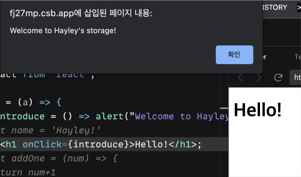 <h1 onClick={introduce}>Hello!</h1>