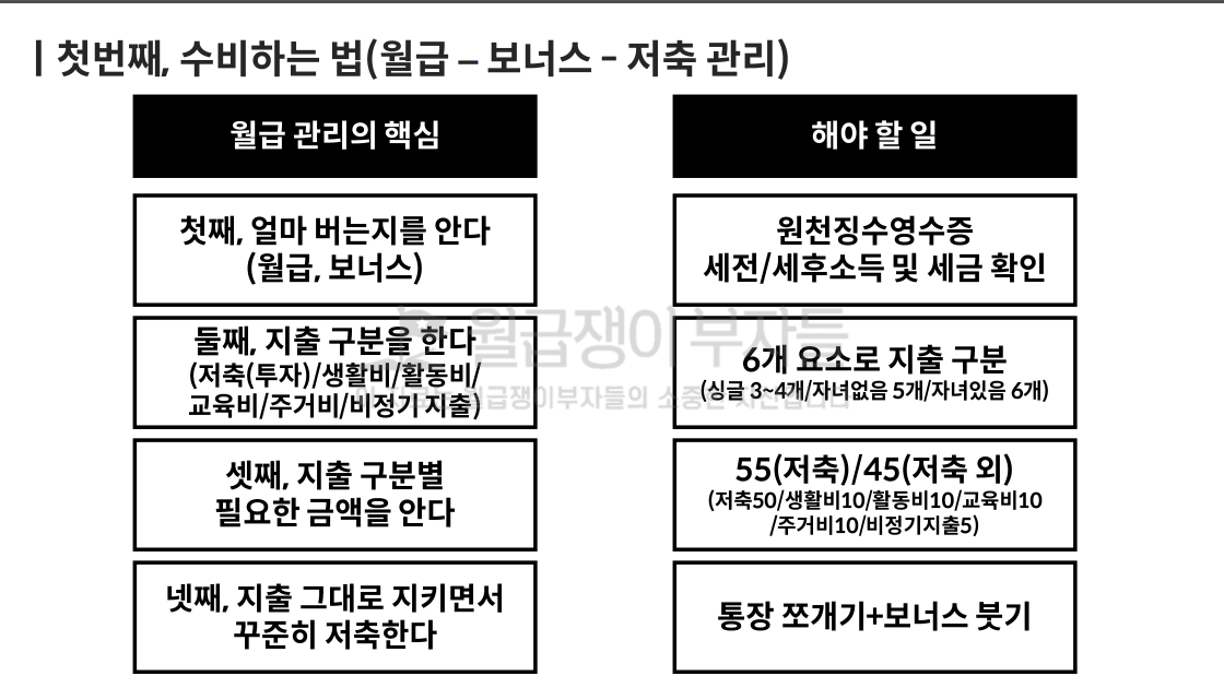 1. 계좌를 만든다 (자산통장, 생활비 통장, 활동비, 주거비, 교육비, 비정기) 총 6개 : 급여통장에 돈을 넣어놓지 말기