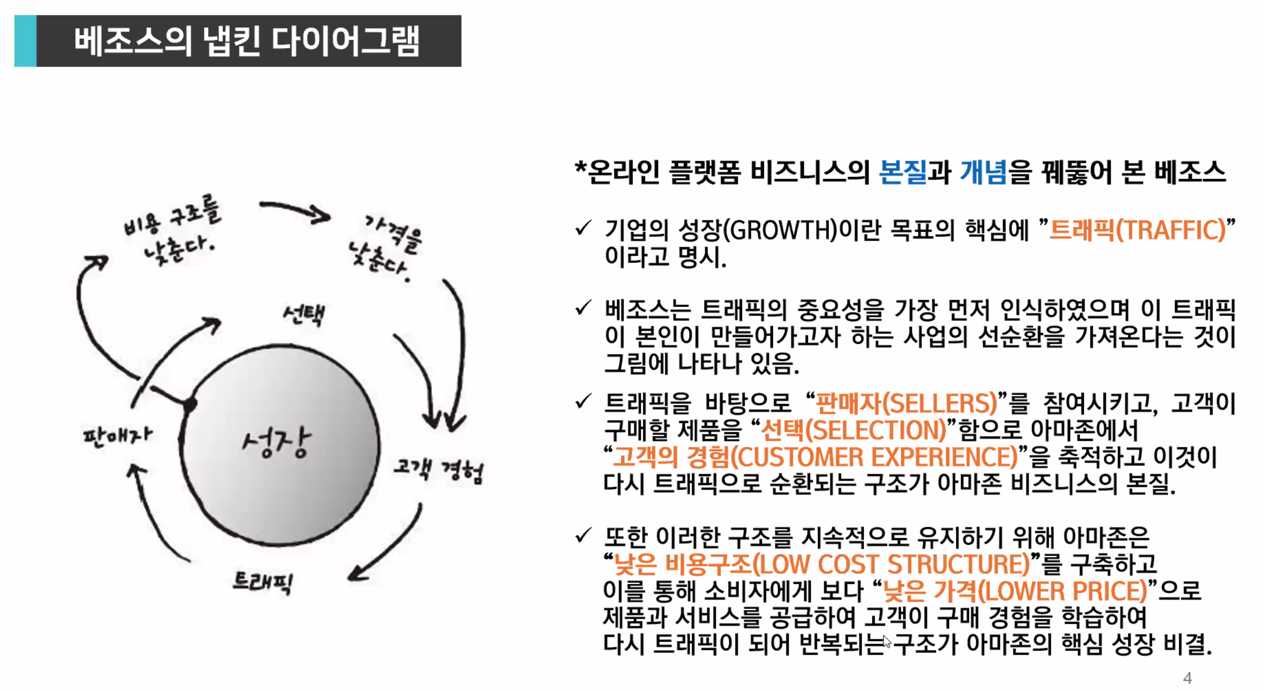 트래픽을 바탕으로 셀러를 참여시키고, 고객들에게 자유로운 참여를 하게 함으로써 아마존이 고객이 구매경험을 최우선으로 할 수 있게 만들어 놨다.