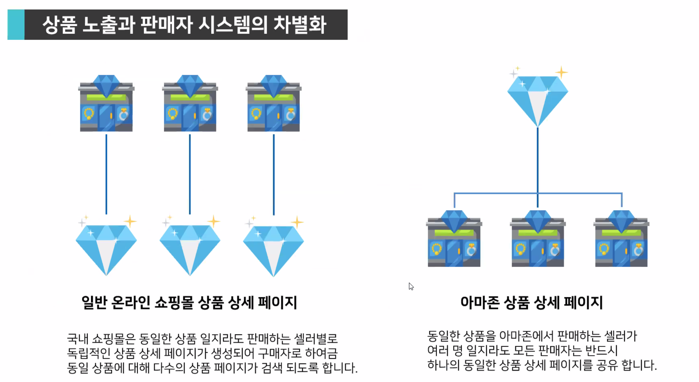 아마존 :상품 기준으로, 상품 페이지를 모든 판매자가 만들 수 없고, 여러명에서 공유하는 방식으로 이루어짐