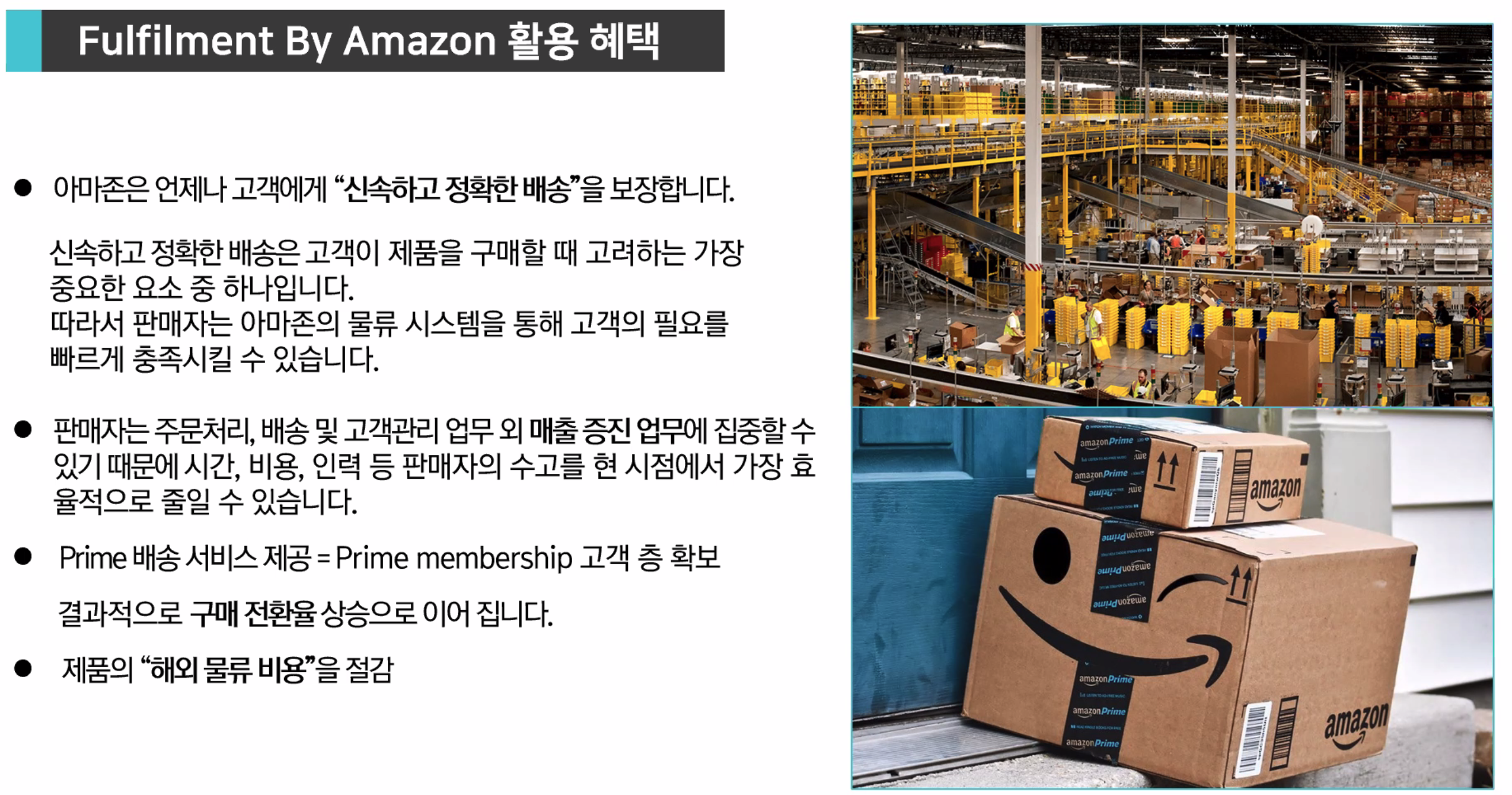 아마존이 배송만 대행해 주는게 아니라, 교환, 환불 , CS 도 같이 병행 하고있기 때문에 아마존 커버가 가능 함 (인건비 절감, 시간아끼기 가능)
