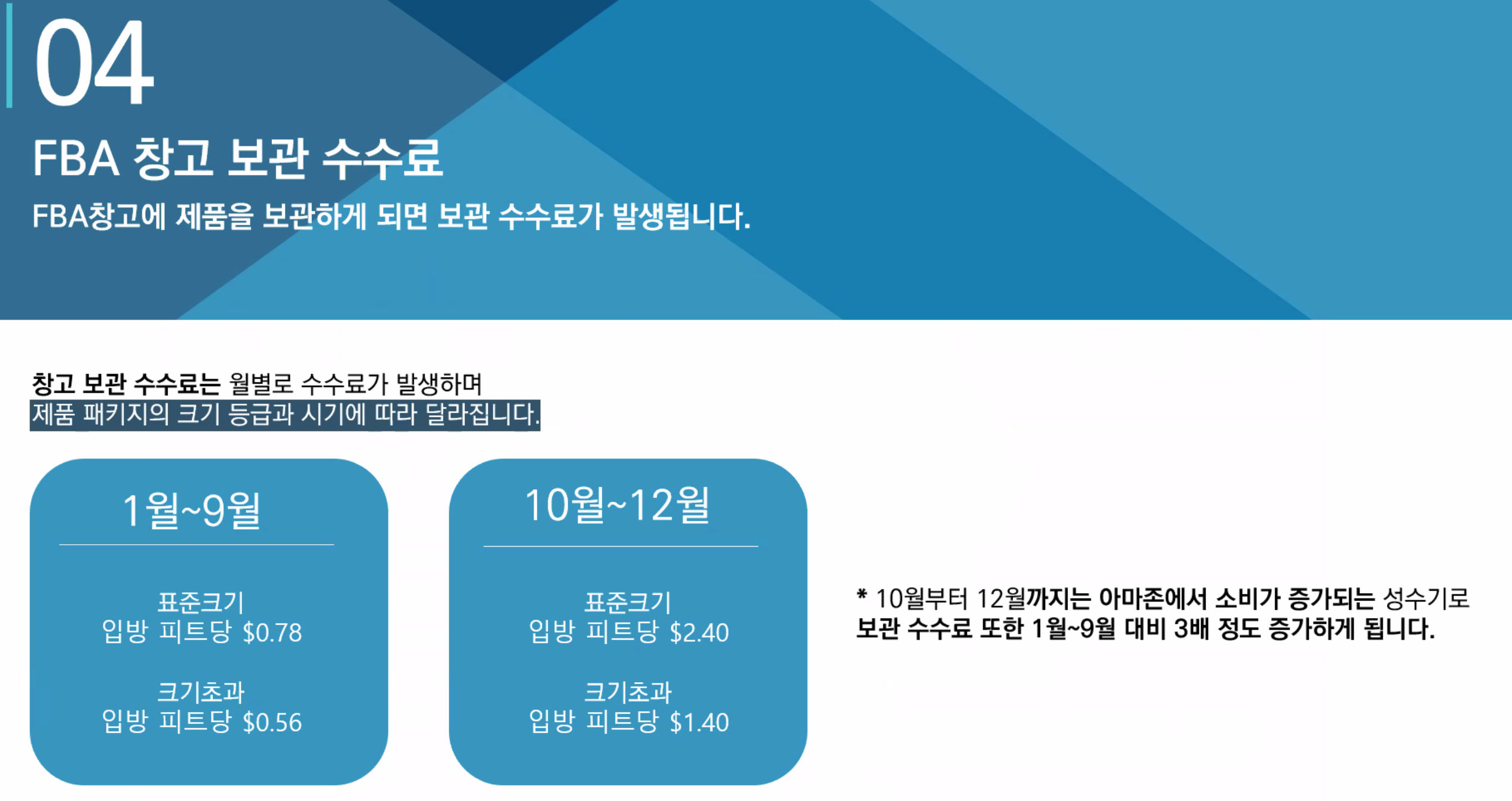 3. FBA창고 보관료 : 제품에 따라 상이함. 장기보관 수수료 : 6개월 이후부터 서서히 증가 함.
