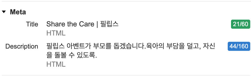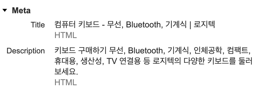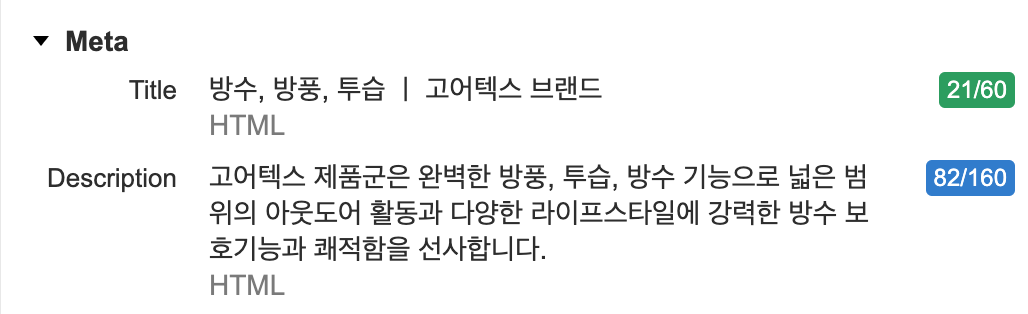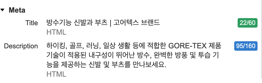 '신발' 카테고리로 이동했을 때의 설정되어있는 Title 및 Description 부분을 볼 수 있는데,