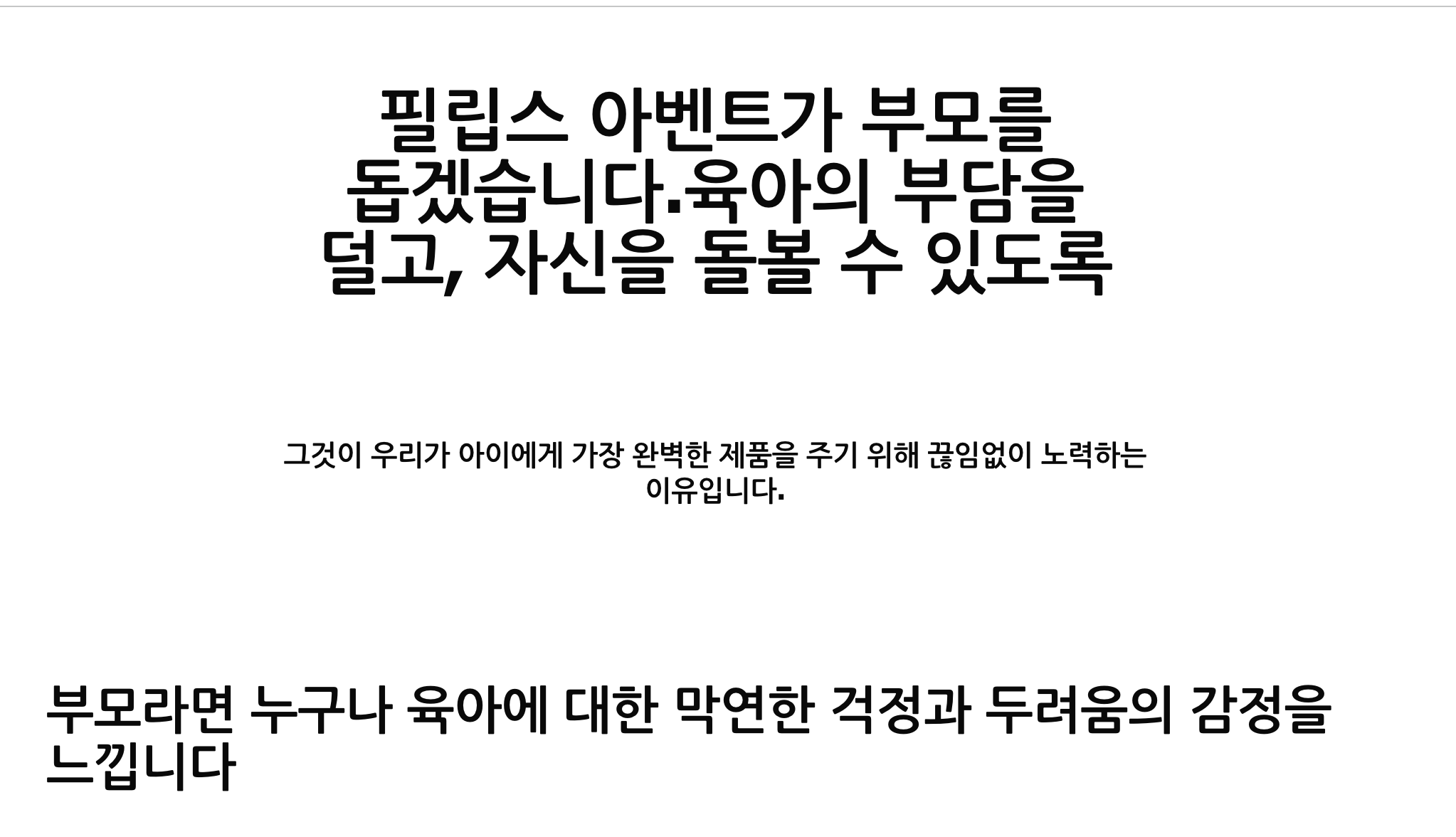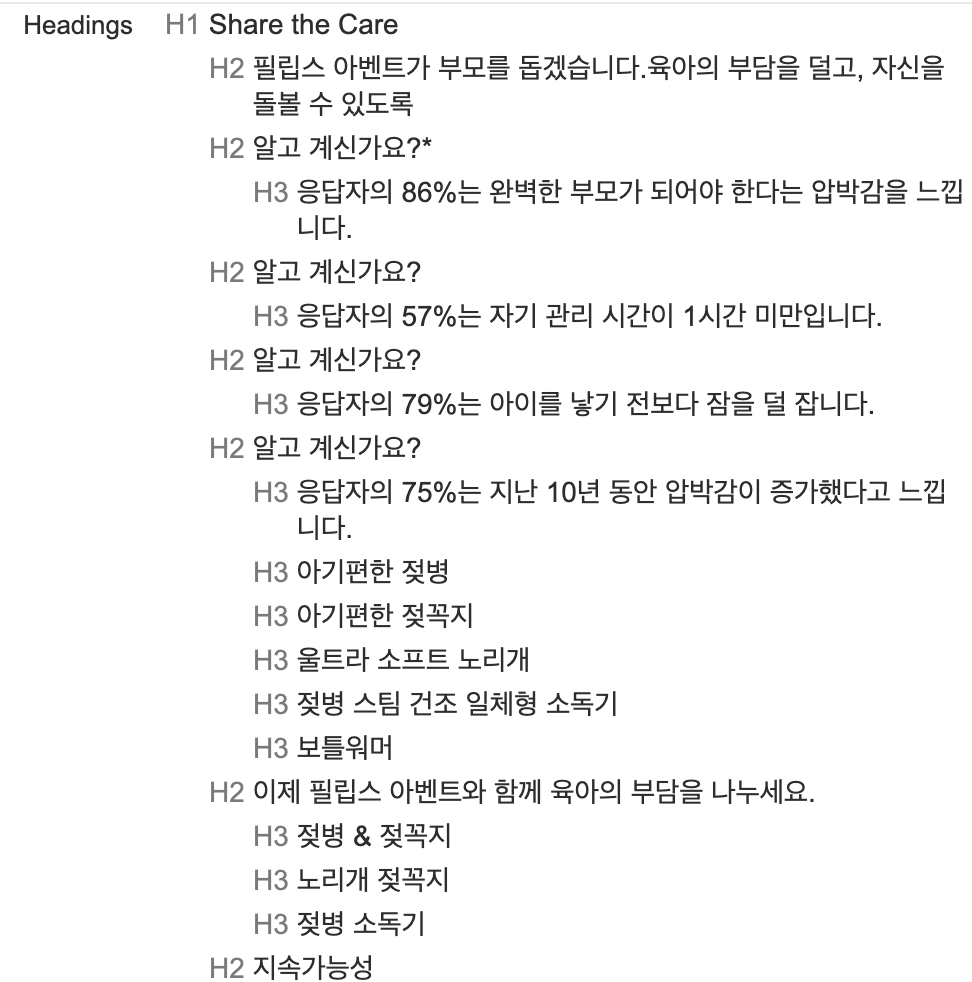 아이를 키운다면 필요하다고 생각되는 키워드와 중요한 기능들을 헤딩영역으로 지정을 해서 페이지에 대한 구조화도 깔끔하게 정리되어있습니다.