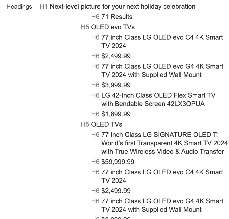 H1으로 현재 프로모션 중임을 강조하고있고, H5로는 TV종류를 그리고 H6로 각각 TV설명과 가격을 표기하면서 정리가 잘 되어있는 것을 확인할 수 있었습니다.