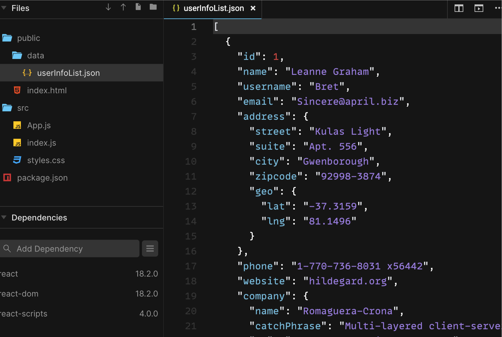 이 파일이 실제로 불러올 유저 API 처럼 만든 Mock Data이다.