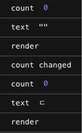 명백하게 리렌더링은 되었고, count는 0, 텍스트는 1번 바뀌었고, 렌더링이 되었다는 render도 찍혔으나 한번 변화에서 count changed라는 콘솔은 찍히지 않았다.