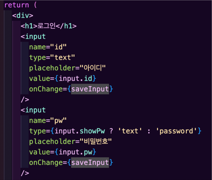 두 번째에는 saveInput 으로 통일해서 onChange 이벤트에 의해 호출되며, e 인자로 이벤트 객체를 받는다.