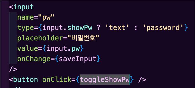 toggleShowPw 함수는 비밀번호 입력 필드에서 입력된 값을 보이거나 숨기는 역할을 하게 로직을 구현해 보았다.