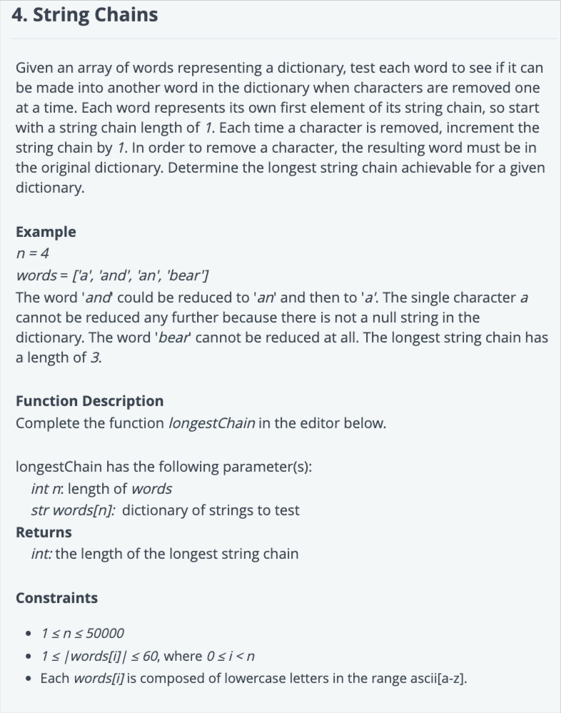 function longestChain(words) {