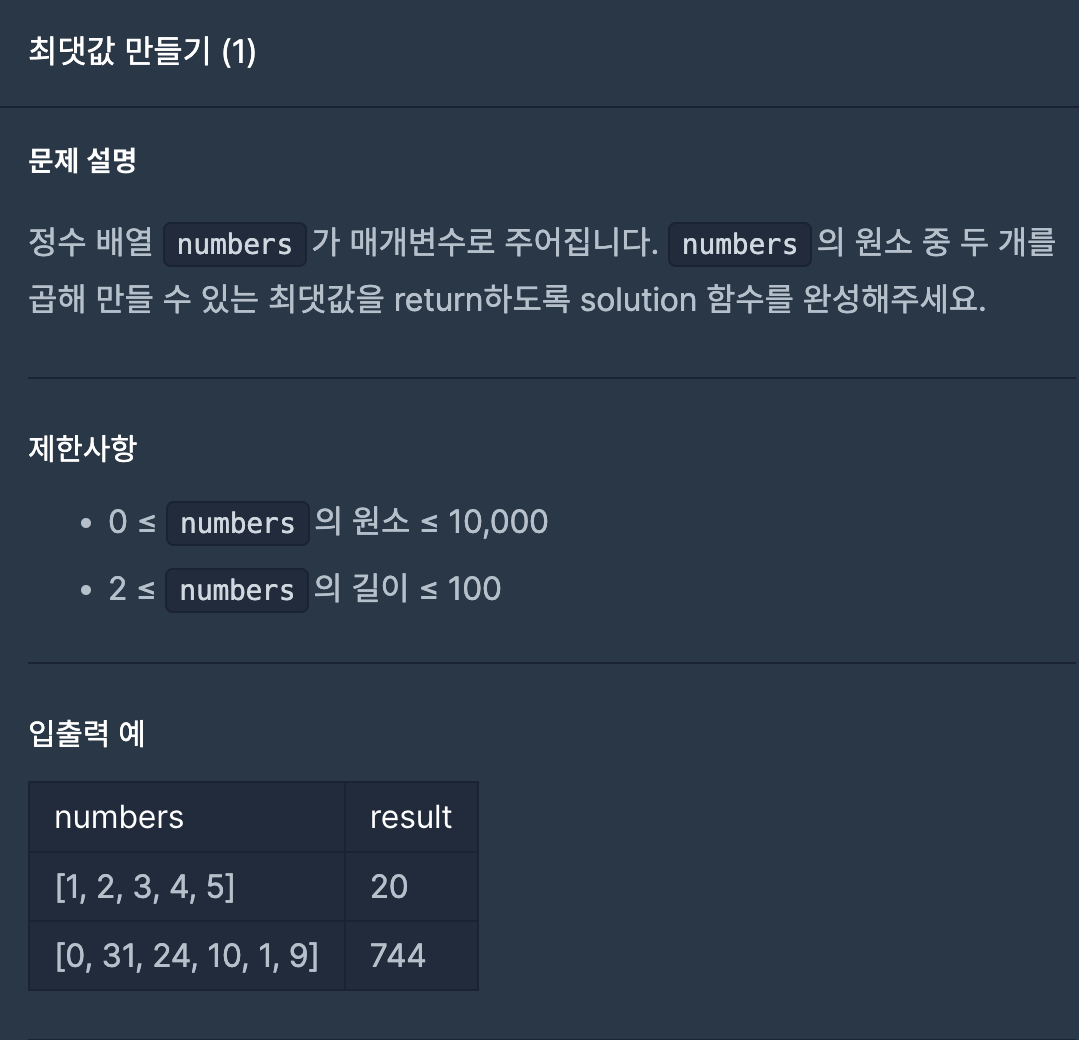 [프로그래머스] 코테 (최댓값 만들기(1))