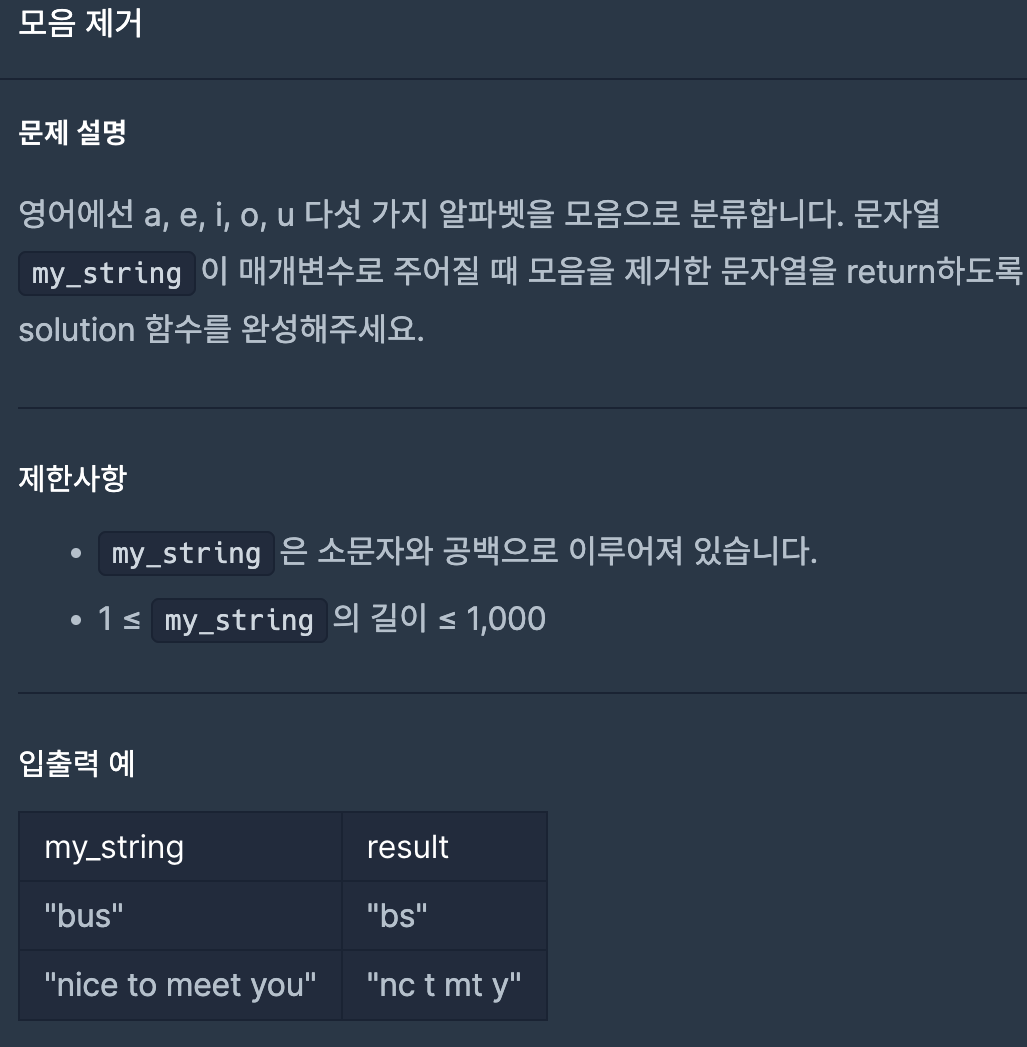 4. '': 두 번째 매개변수로 들어간 빈 문자열은, 찾은 패턴을 모두 빈 문자열로 바꾸라는 의미입니다. 즉, 모음을 제거하고 빈 문자열로 대체하게 된다.
